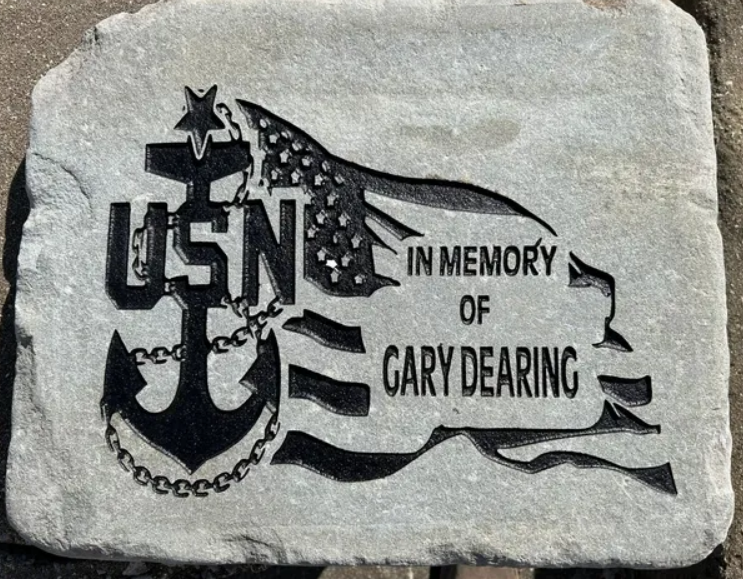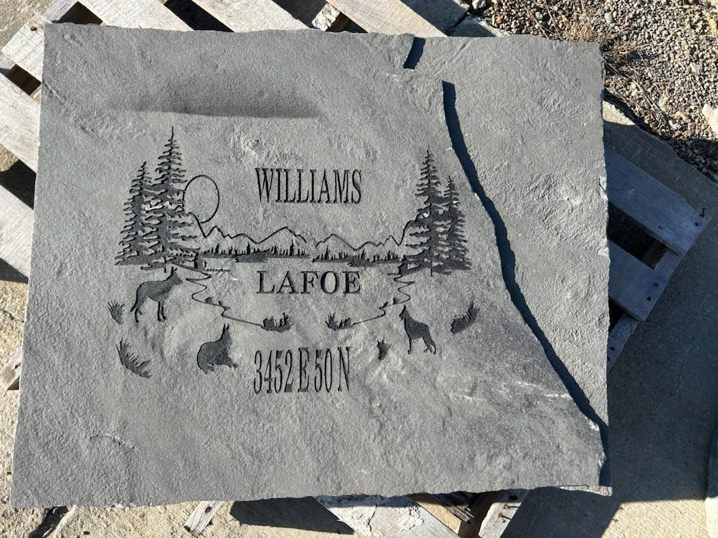 How it works: We have many materials to choose from on our yard. Visit our yard to choose a stone for your project. For the stone to be engraved it must have a flat smooth surface large enough to fit the template your design will require. Once you have selected your rock our engraving specialist will then work with you on your custom designed font and or image. Once you have approved the design we will then begin sandblasting the design. The sandblasted design can be left natural or accented with a weather resistant paint. Black is the most common. Prices will vary per size and project. You can pick up your finished stone or delivery is available.